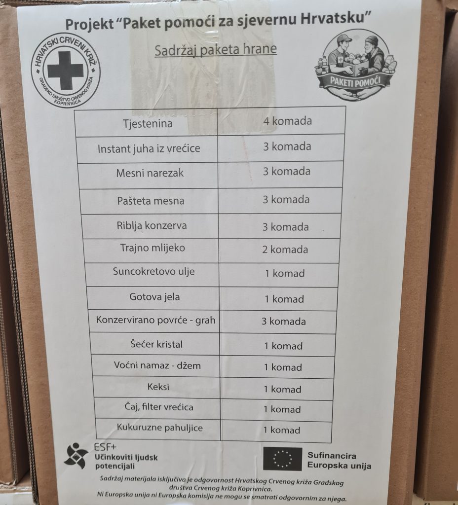 Provedbom projekta „Paketi pomoći za sjevernu Hrvatsku“ do kolovoza 2028. godine Gradsko društvo Crvenog križa Koprivnica i dvadeset jedno partnersko društvo Crvenog križa podijeliti će najmanje 80.000 paketa hrane i 20.000 paketa osnovne materijalne pomoći za otprilike 8.000 pripadnika ciljane skupine, samce i kućanstva koja žive u siromaštvu ili su u riziku od siromaštva na području sjeverne Hrvatske.