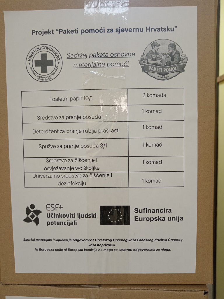 Gradsko društvo Crvenog križa Koprivnica kao nositelj projekta te dvadeset jedno društvo Crvenog križa na području Koprivničko – križevačke, Varaždinske, Međimurske, Krapinsko – zagorske i Zagrebačke županije u ulozi partnera tijekom veljače počeli su s podjelama paketa hrane i higijene korisnicima projekta, osobama u riziku ili na granici siromaštva.